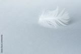 Delicate fluffy bird feather on a light blue background. The concept of lightness, airiness and softness. Copy space
