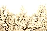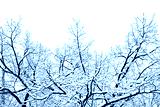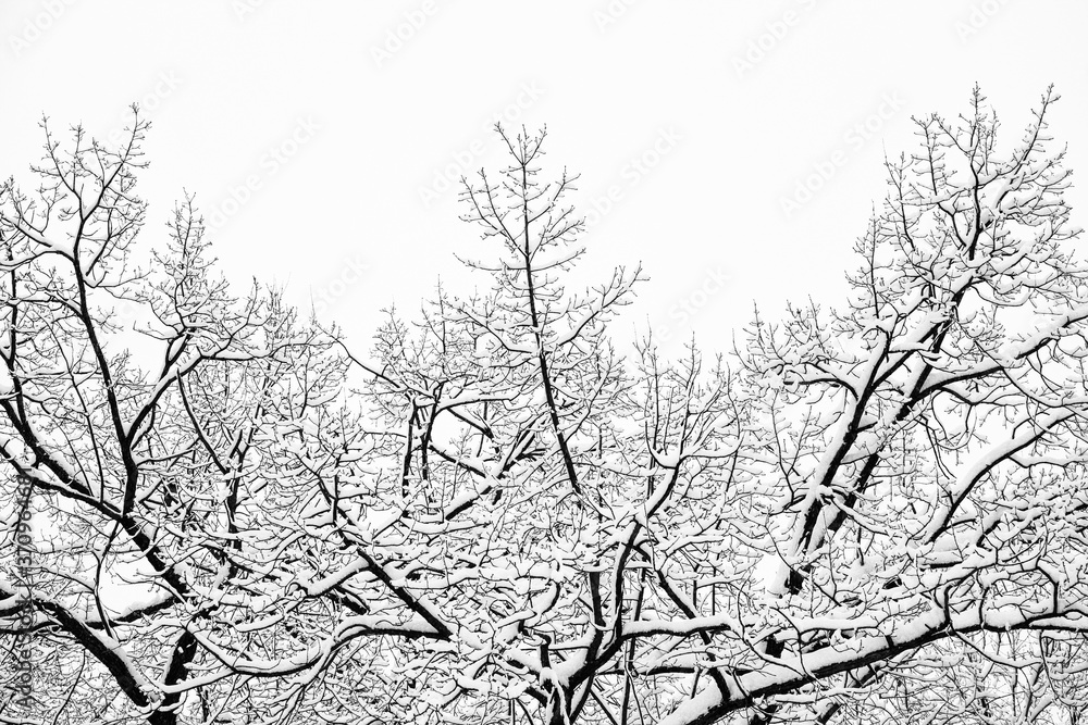 Fluffy snow-covered tree branch after snowfall. Beautiful winter nature park outdoor background.