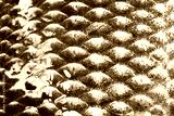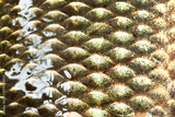 Fish scales skin texture macro view. Geometric pattern photo Crucian carp Carassius scaly. Selective focus, shallow depth field