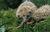 European Hedgehog, erinaceus europaeus, Adults eating Earthworm, Normandy