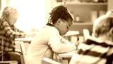 In Elementary School Classroom Brilliant Black Girl Writes in Exercise Notebook, Taking Test and Writing Exam. Junior Classroom with Group of Bright Children Working Diligently and Learning New Stuff