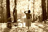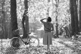 Stylish woman with a bicycle enjoying autumn weather in the park. Beautiful Woman walking in the autumn forest.