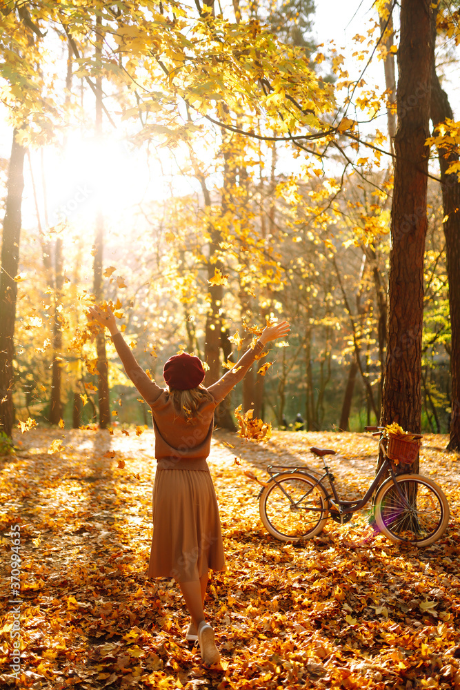 Stylish woman with a bicycle enjoying autumn weather in the park. Beautiful Woman walking in the autumn forest.