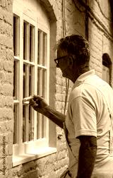 Hampshire, England, UK. 2020. Painter decorator painting small windows on a rural house