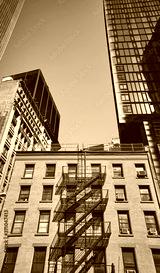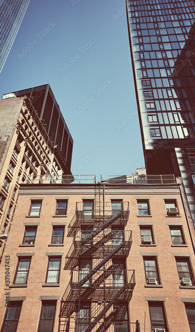 Old brick tenement house among modern skyscrapers in New York City, color toning applied, USA.