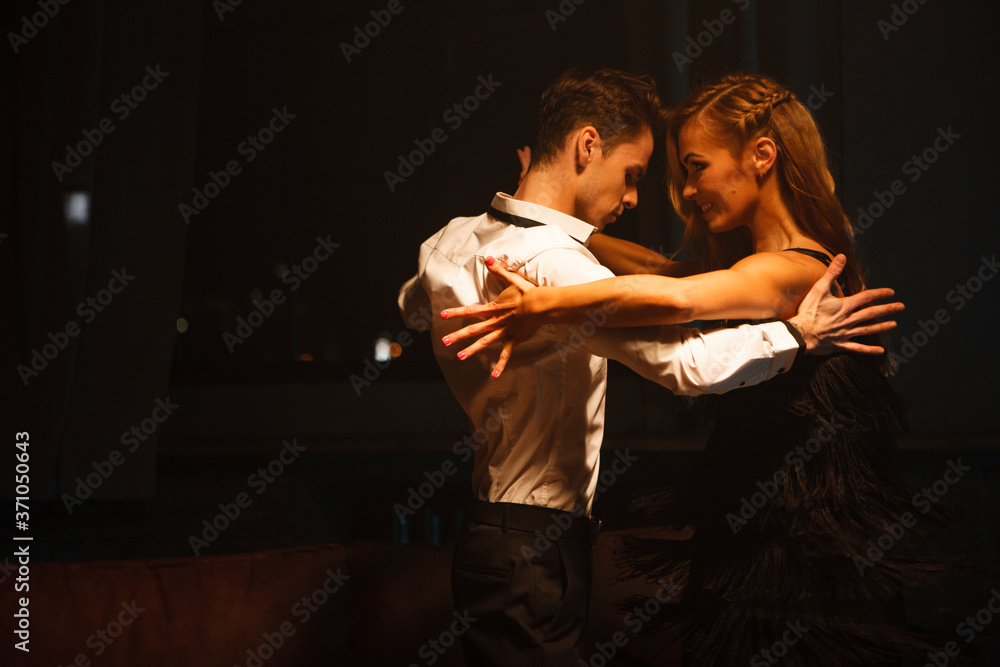 Dance and love concept. Young couple in elegant evening dresses posing in the room filled with dramatic light. Two dancers man and woman holding each other in passionate pose