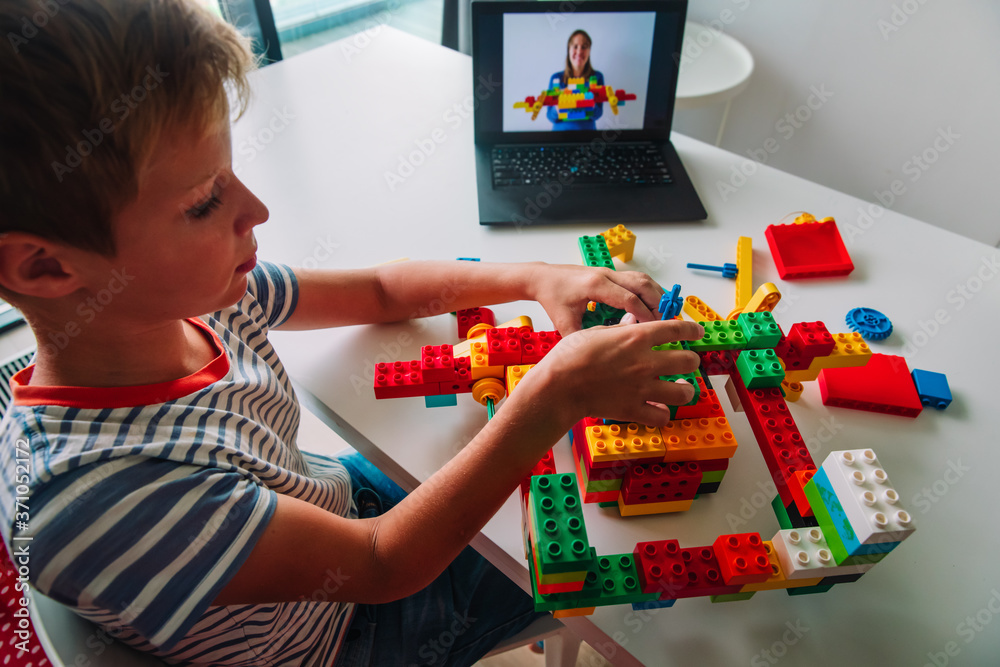 kid building project with constructor during online lesson. Remote learning.