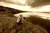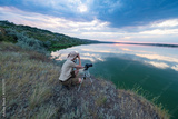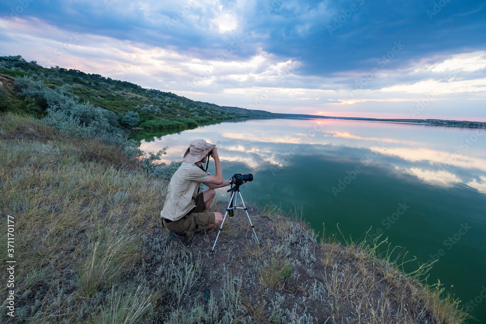 Young male traveler or scientist with binocular and photo camera outdoors near river.