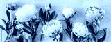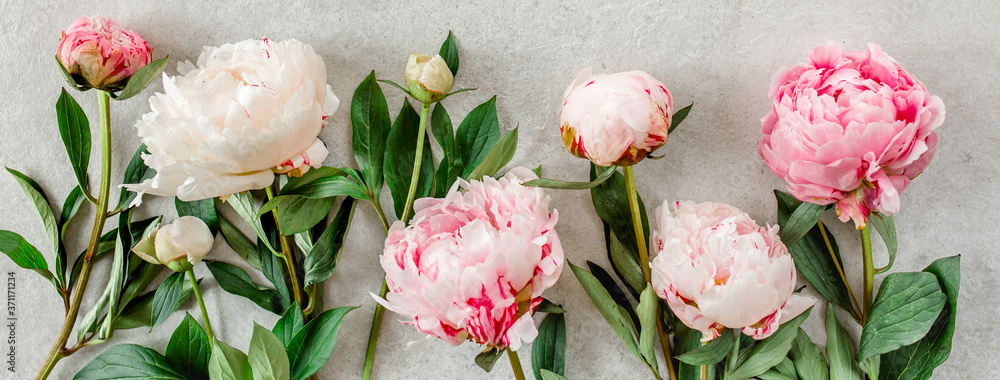 Beautiful pink peony flowers on gray stone table with copy space for your text. Flat style, top view
