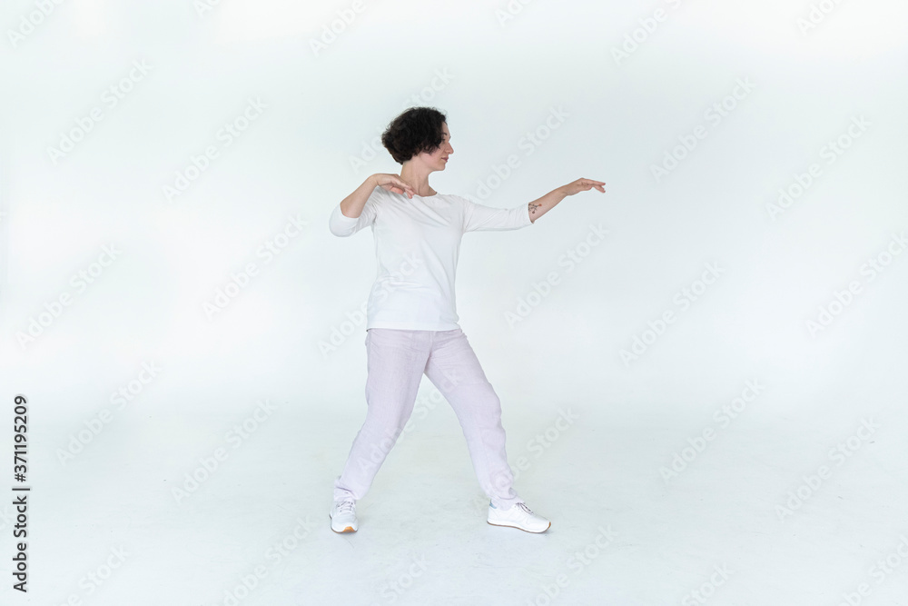 woman practicing qi qong at white studio traditional chinese gymnastics