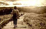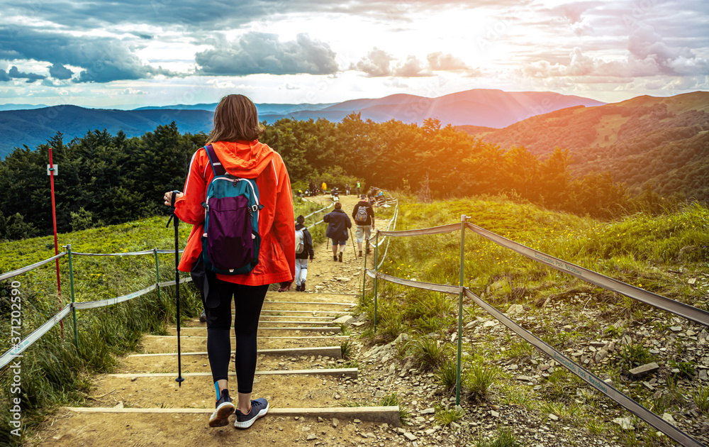 Girl hiking in the mountains. Hiking at sunset in Bieszczady Poland.