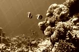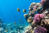 Pennant coralfish (longfin bannerfish), Butterflyfish (Chaetodon) and Parrotfish in colorful coral reef, Red Sea, Egypt. Bright yellow striped tropical fish in the ocean, clear blue turquoise water.