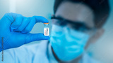Doctor hand in blue gloves holding Covid-19 vaccine and syringe disease preparing for coronavirus infected patient.Healthcare and medicine concept.Scientist with a stethoscope holding syringe vaccine.