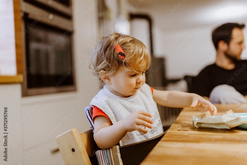 Baby girl unwrapping cookies with father in background