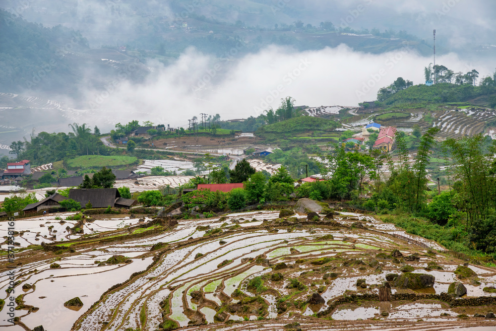 Rice field terraces. Mountain view in the clouds. Sapa, Lao Cai Province, north-west Vietnam