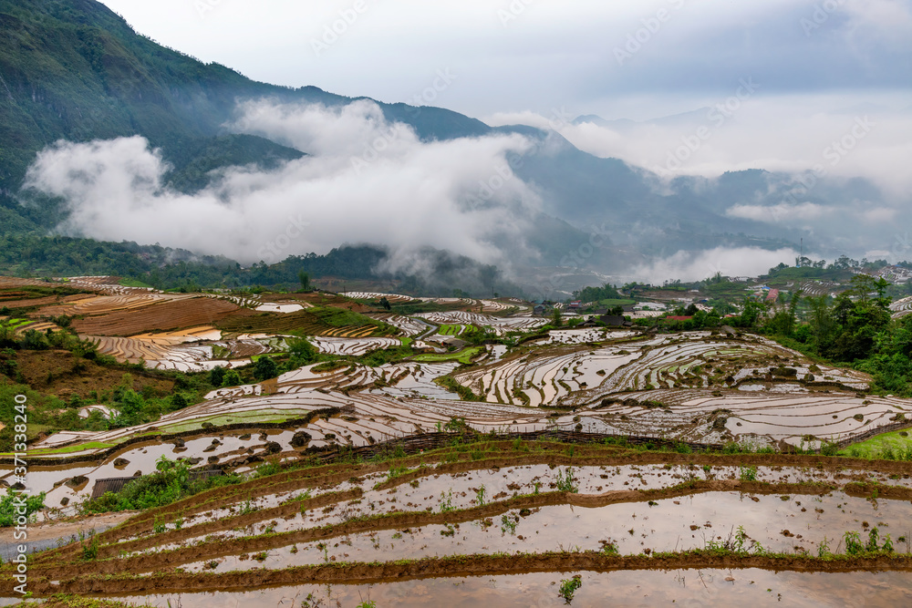 Rice field terraces. Mountain view in the clouds. Sapa, Lao Cai Province, north-west Vietnam