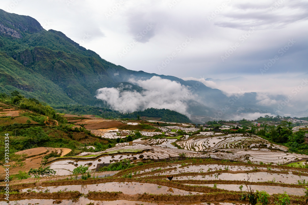 Rice field terraces. Mountain view in the clouds. Sapa, Lao Cai Province, north-west Vietnam