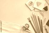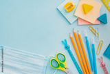 school supplies with medical face mask blue background. Protection schoolchildren students from covid-19 coronavirus, school education context pandemic
