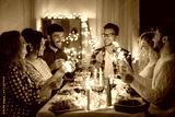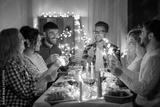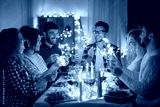 holidays, celebration and people concept - happy friends with sparklers having christmas dinner at home
