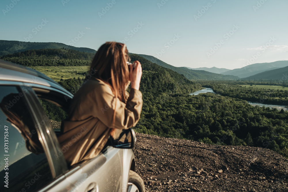 Young Traveler Woman on a Road Trip, Girl Enjoying Journey on Her Car, Making Photo on Retro Old Camera