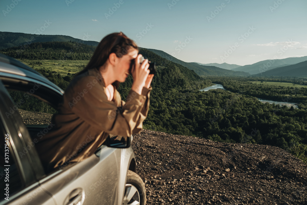 Young Traveler Woman on a Road Trip, Girl Enjoying Journey on Her Car, Making Photo on Retro Old Camera