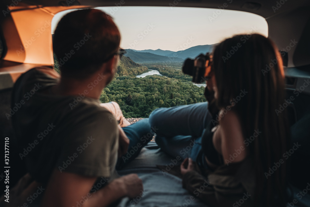 Happy Young Couple Lying in the Trunk of Their Car Enjoying Roadtrip, Woman Taking Photo on Retro Old Camera