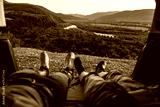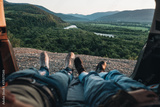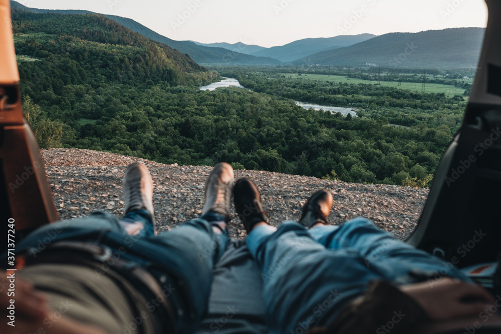 Rear View of Happy Young Couple Lying in the Trunk of Their Car and Enjoying Roadtrip, Mountains and River on the Horizon