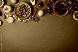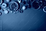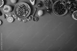 Border of healthy food and measuring tape on red background. Weight loss concept. Top view with copy space.