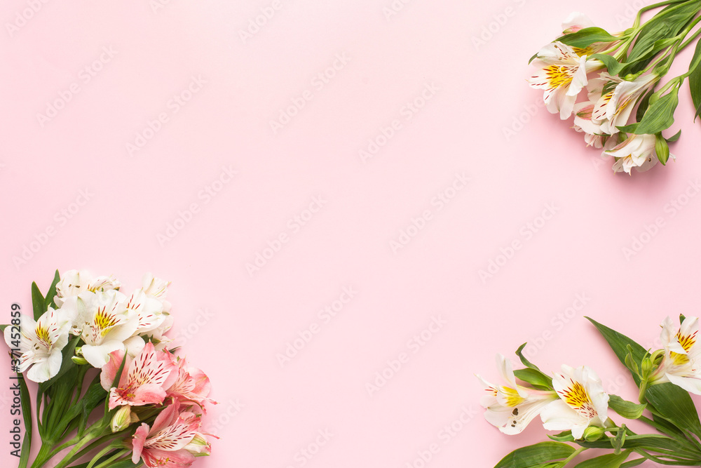 White and pink flowers Alstroemeria on a pink background with copyspace