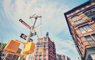 West Broadway and Franklin Street sign, color toning applied, New York City, USA.