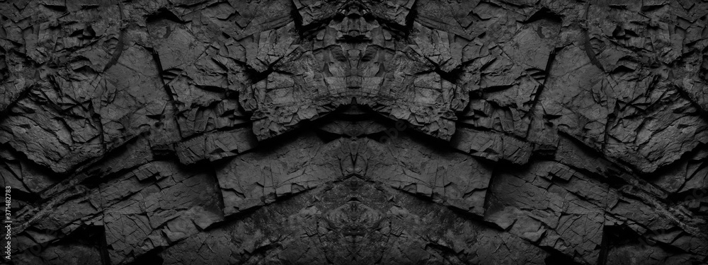 Black and white background. Old stone wall. Black brick wall. Fantasy. Antique stone arch effect. Baner with rock texture.