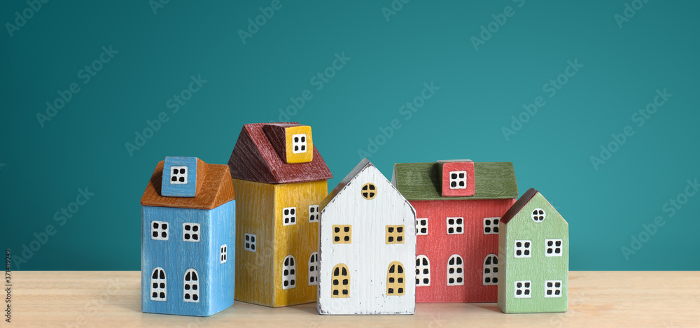 Wood miniature multicolor house on wooden table.
