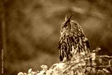 Eurasian eagle-owl on the right side, looking left with copy space for text. Bubo bubo