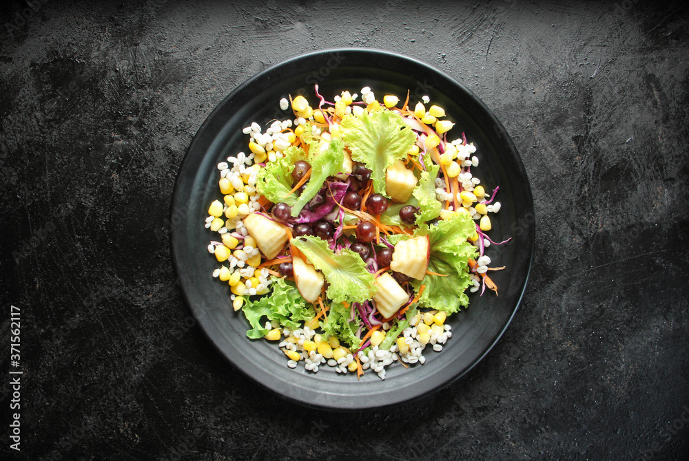 Healthy fruit and vegetable salad, lettuce, corn, grapes, apples on plate. Diet menu. Top view.