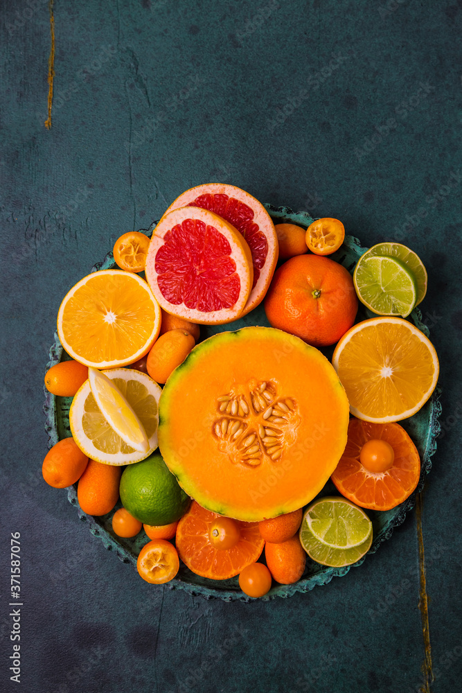 Flat lay layout of fruit citrus and other sommer fruits on green background