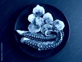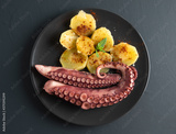 Cooked octopus with potatoes, on black plate and rustic background, top view