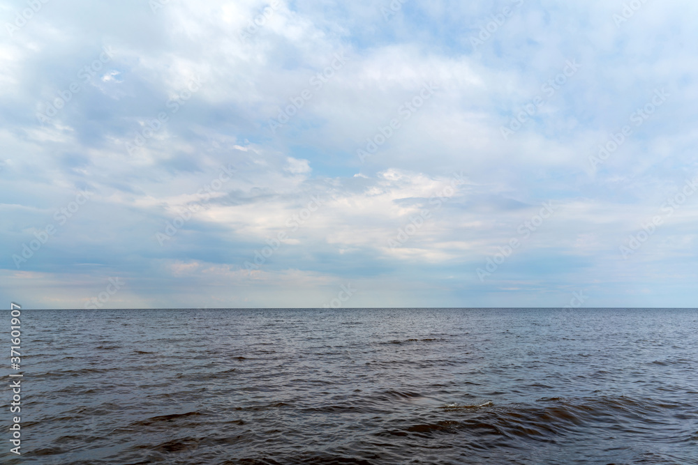 White clouds in the blue sky over the lake. Atmospheric natural background.