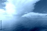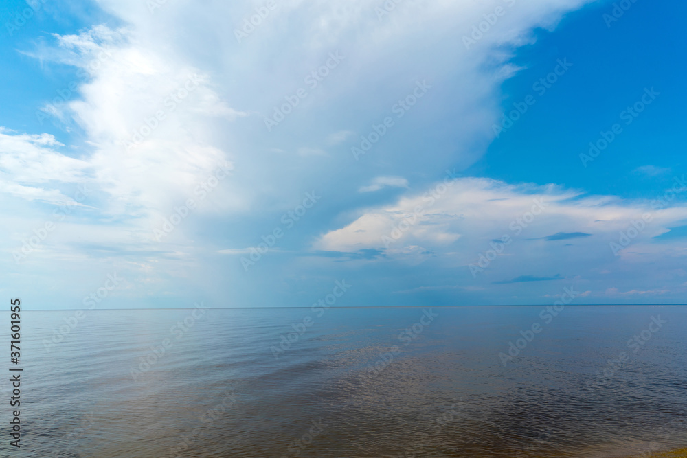 White clouds in the blue sky over the lake. Atmospheric natural background.