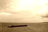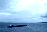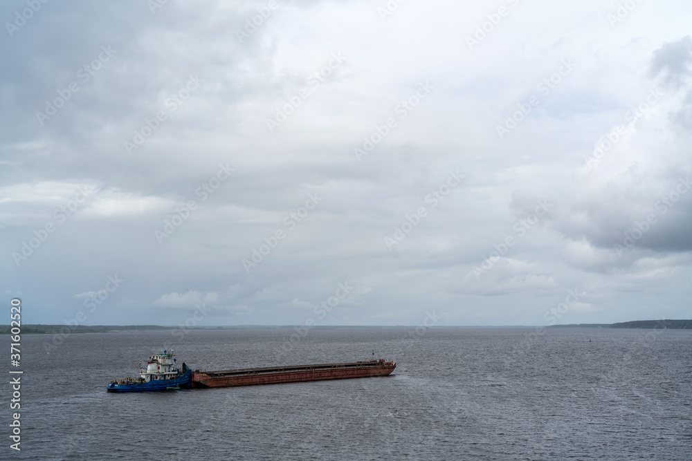 The barge floats down the river on a cloudy day. Transportation of goods by water.