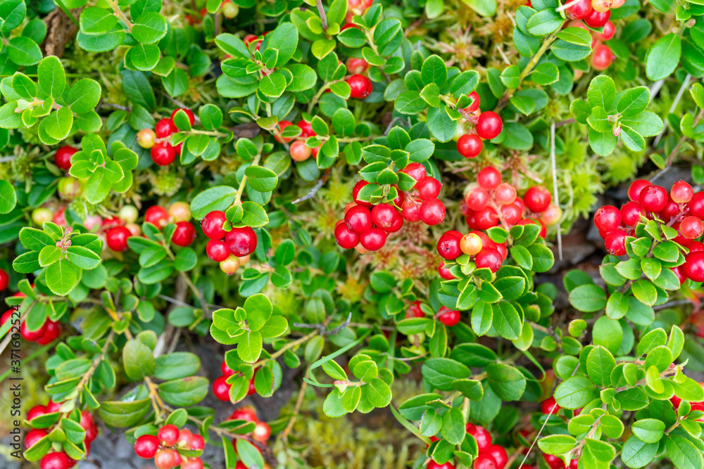 Lingonberry bushes in the forest. Red ripe wild berries. Natural background.