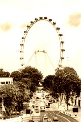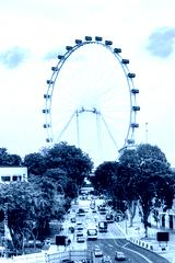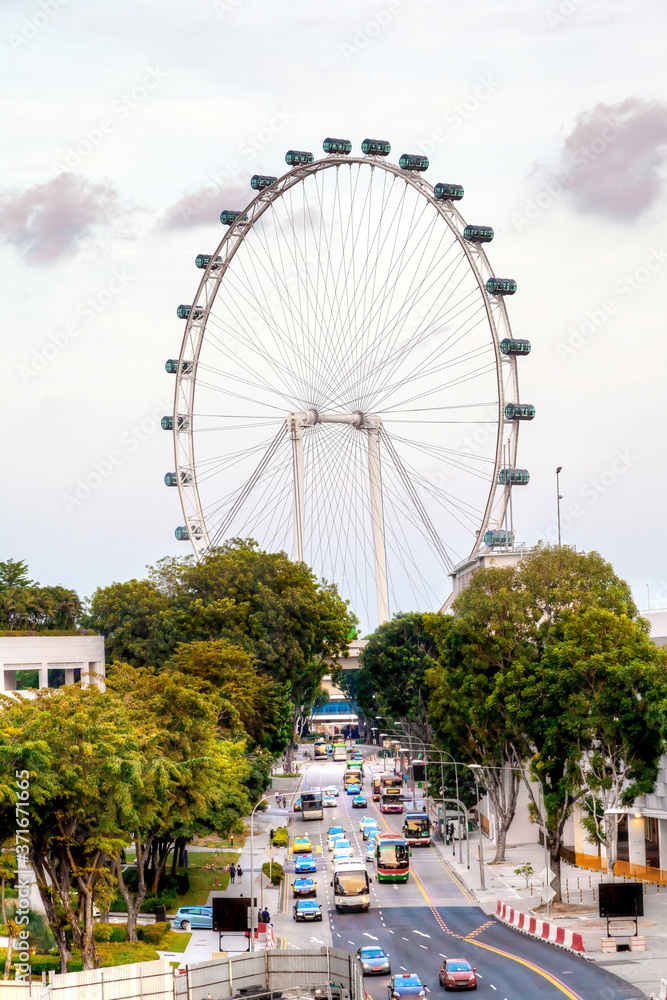 Singapore Flyer ferris wheel dominates the skyline at Marina Bay.