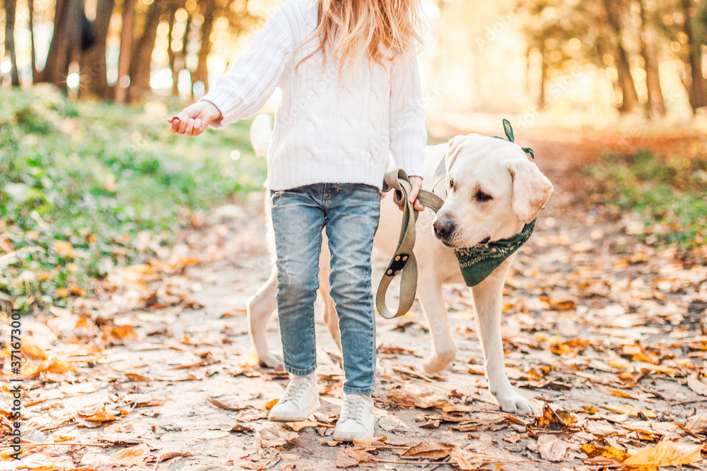 Little beautiful girl with dog labrador.