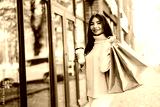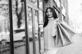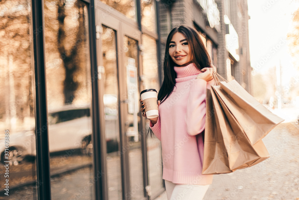 Beautiful smiling young woman with shopping bags and coffee on the street.