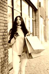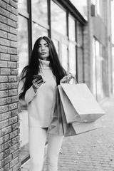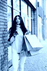 Beautiful smiling young woman with shopping bags and phone on the street.