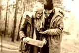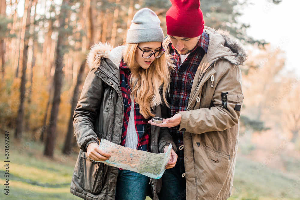 Travel couple with map, compass and backpack in the forest. Freedom and active travel concept.