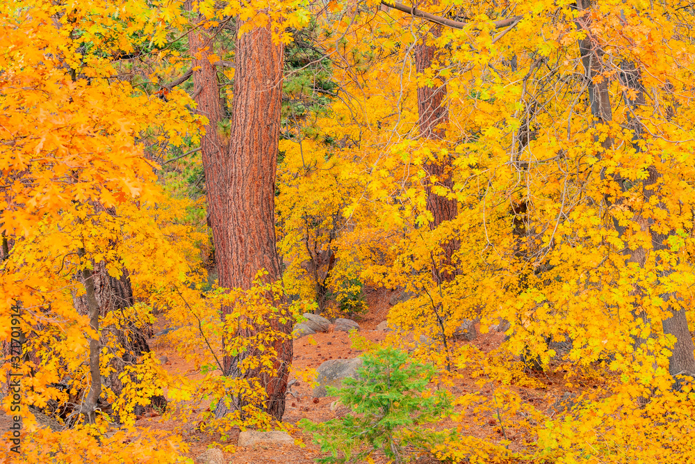 Autumn Oak trees and pines fill the San Bernardino Mountains in Big Bear Lake, California