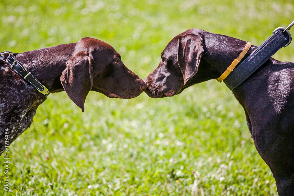 meeting dogs on the lawn.the pointers met noses.Dogs on a green background.Hunting dogs look at each other