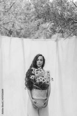 Portrait of young brunette woman on background of white hanging textile cloth in garden. Holding straw basket with yellow flowers, summer linen dress.