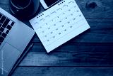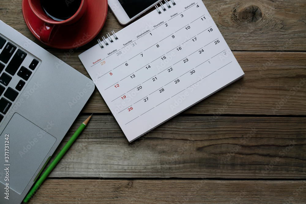 close up of calendar and computer on the table, planning for business meeting or travel planning concept