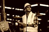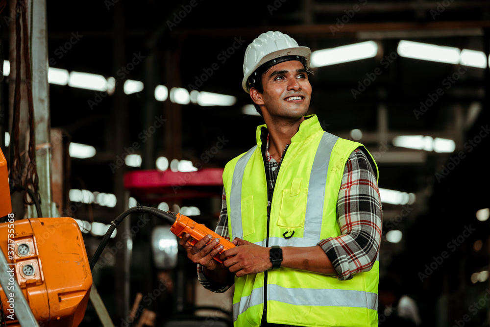 Young industrial worker man working with metal machine in factory with many equipment
